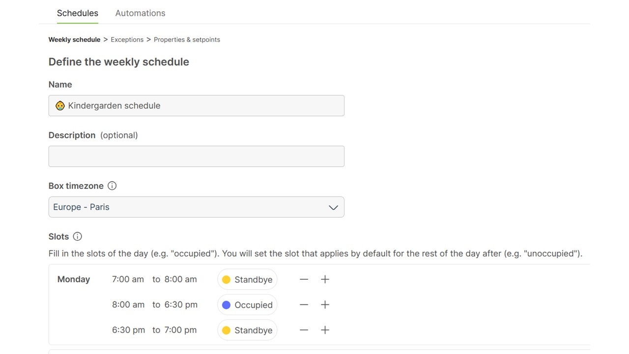 - Choose which properties will be controlled by the schedule during the various time slots. Example: change radiator temperature