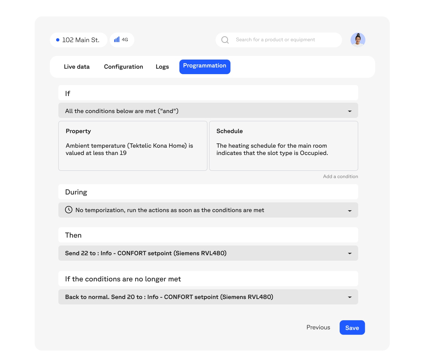 Steuern Sie Ihre HLK-Geräte einfach, ohne sie zu ersetzen, indem Sie zum Beispiel thermostatische Ventile oder Kommunikationskarten installieren, die direkt mit unserer Lösung Überwachen Sie Ihre Zeitpläne über eine Web-Oberfläche und stellen Sie sicher, dass Ihre Befehle reibungslos ausgeführt werden.