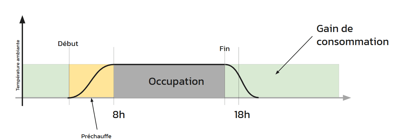 Une fois la période d’occupation définie, vous pouvez y ajouter une durée de « préchauffe » (en jaune) qui dépend de l’inertie de votre bâtiment. En général, une heure suffit pour atteindre la température souhaitée.