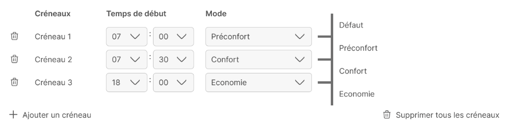 - Définissez la température de consigne à appliquer à chaque planning selon sa période d’occupation