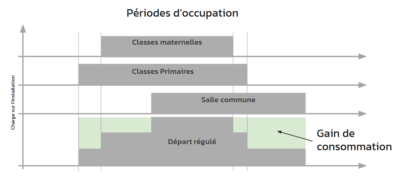 Reprenons l’exemple de notre école. Les classes de primaires sont occupées plus longtemps que les classes de maternelles. Les salles de classe ont des usages différents de la salle commune, souvent utilisée en fin de journée pour le périscolaire ou le mercredi.