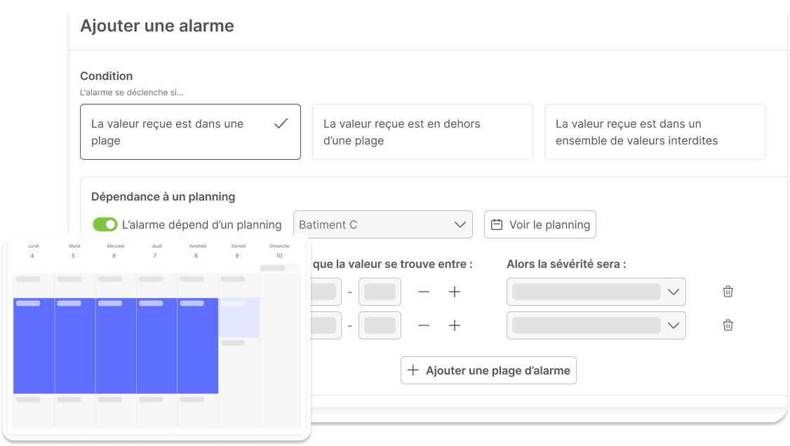 Si vous gérez un ensemble de bureaux ou un immeuble résidentiel, vous savez que maintenir les systèmes de chauffage ou de climatisation à pleine puissance pendant les périodes d’inoccupation est non seulement superflu, mais génère également des coûts inutiles. Wattsense propose la mise en place d’alarmes en vous offrant la possibilité de créer des plannings d'occupation adaptés aux besoins spécifiques de votre bâtiment tertiaire (offre Tower uniquement).
