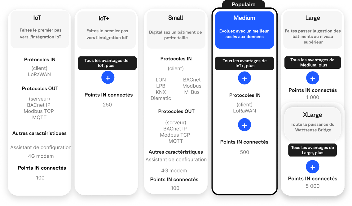 L'introduction de la licence Bridge IoT+, rend le LoRaWAN plus accessible aux petits bâtiments. Avec la licence IoT+, vous obtenez 250 points IN connectés (soit 150 points de plus que la licence IoT standard). La licence Medium bénéficie également d'une nouveauté avec un maximum de points IN connectés qui passe de 250 à 500.