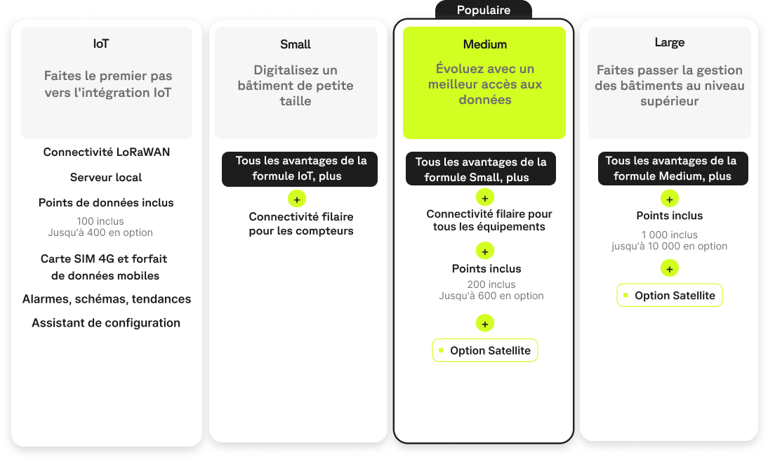 Nous avons le plaisir d'annoncer une amélioration de notre offre et de notre tarification dans le but de vous proposer plus de flexibilité. Dès aujourd'hui, nos licences Bridge incluent une toute nouvelle licence IoT+ et le maximum de points est augmenté pour les abonnements Tower.
