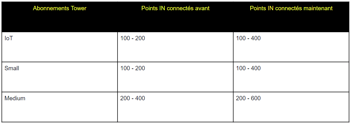 Nous introduisons un maximum plus élevé de points IN connectés pour vos abonnements Tower préférés : IoT, Small et Medium. Nos nouveaux add-ons vous permettent d'adapter votre abonnement aux exigences de votre projet.