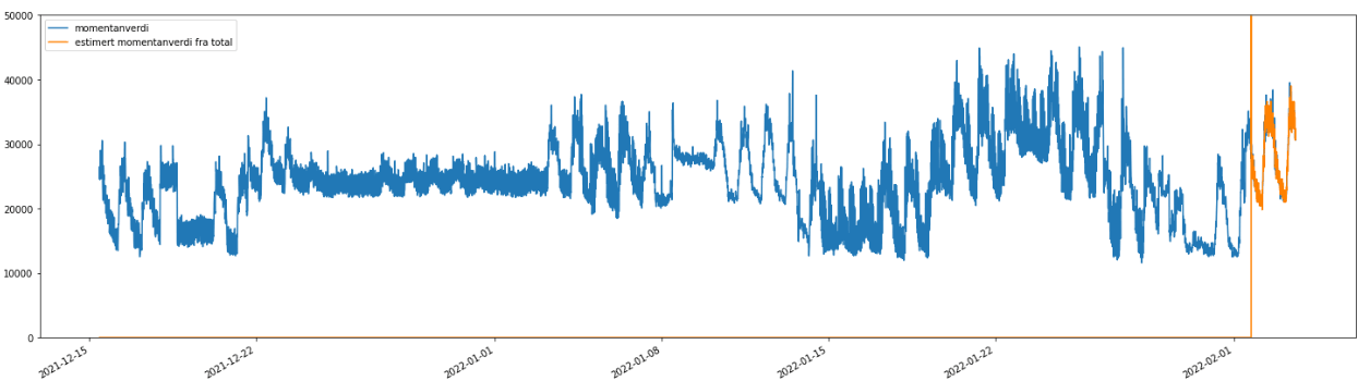 For instance, using Wattsense, SmartEO extracted data from an energy meter and detected that it had been flatlined at ~500,000 kWh for more than 200 days (blue line, figure 2). Based on the measured power from the same meter (blue line, figure 3), SmartEO calculated and reconstructed actual energy consumption (orange line, figure 2) for the locked time period.